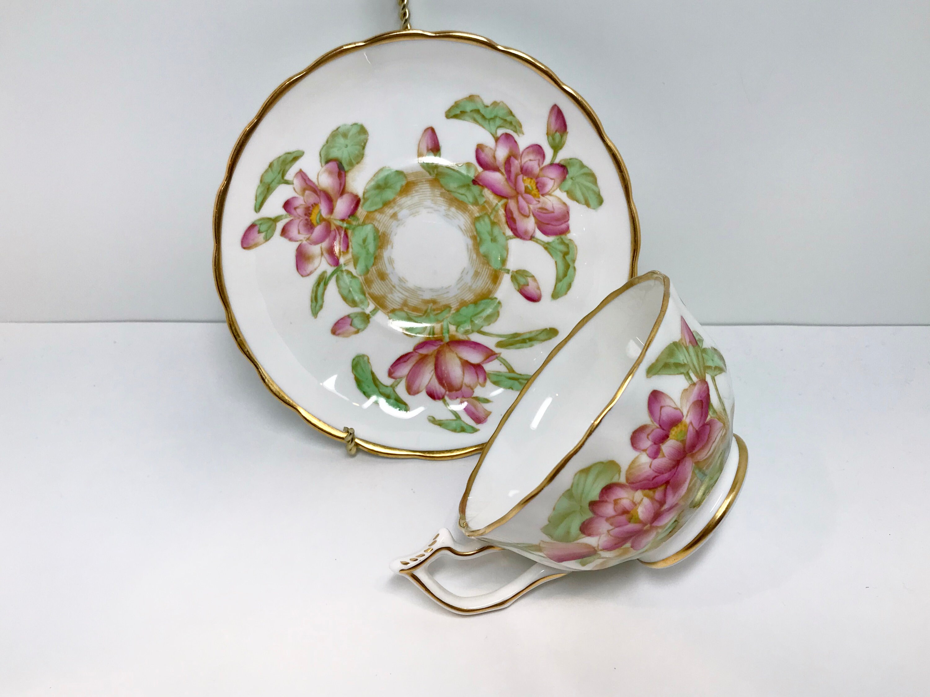 With a trimmed footed cup and handle, the hand painted water lily design is mesmerizing.