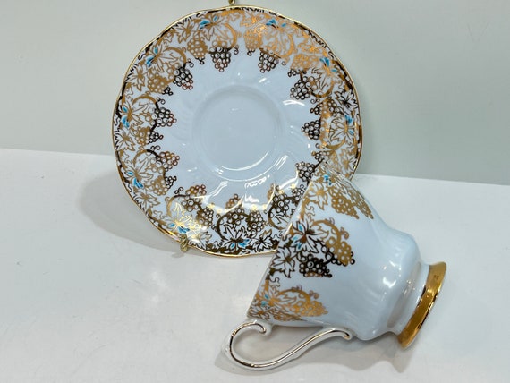 Royal Grafton Turquoise Teacup and Saucer: Gold Victorian Bone China